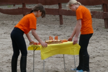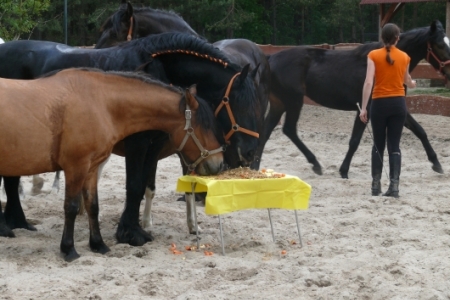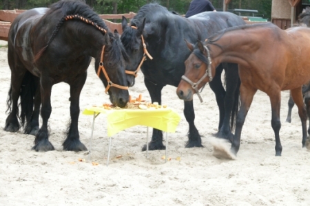 Impreza miała charakter kameralny. Część pierwsza zorganizowana była w stajni i obejmowała pokazy młodych jeźdźców i ich koni oraz pokaz woltyżerki. Tradycyjnie ta część zakończyła się obdarowaniem koni tortem, które bardzo chętnie schrupały ten smakołyk wykonany ze zbóż, marchewek i innych końskich przysmaków.