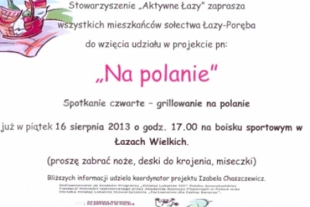 Już w piątek 16 sierpnia zapraszamy na czwarte spotkanie w ramach projektu "Na polanie", które odbędzie się na boisku sportowym w Łazach Wielkich. Spotkanie pod nazwą "Grillowanie na polanie" rozpocznie się o godz. 17.00, a grillować i zapiekać będziemy warzywa z różnymi farszami. Na warsztaty można przynieść noże, deski do krojenia, miseczki.