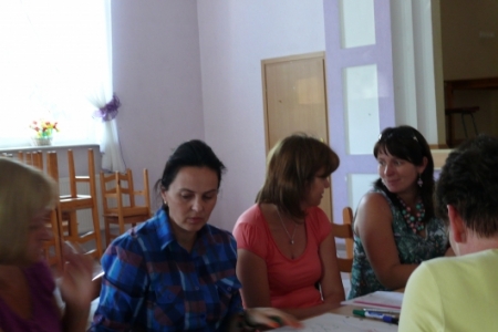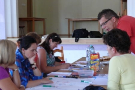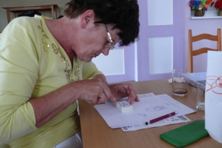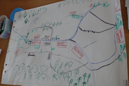 Rozpoczęłyśmy od narysowania mapy naszej miejscowości, aby ułatwić sobie dalszą pracę. Następnie przystąpiłyśmy do określenia, tematów odpowiednich do questingu, które można wykorzystać w naszej miejscowości. Ponieważ od zeszłego roku bardzo intensywnie interesujemy się ziołami, właśnie tym tematem postanowiłyśmy się zająć. Pozostało wybrać odpowiedni fragment miejscowości, na którym umieścimy naszą grę terenową. I tu niestety zrodził się problem, ponieważ brakuje u nas miejsc, które stworzyły by pętlę, aby początek i koniec zabawy znajdowały się w tym samym miejscu. W tym miejscu, po bardzo wyczerpującej pracy umysłowej zrobiliśmy przerwę na lunch, aby wzmocnić ciało i umysł. Po posiłku, z wybranym najbardziej optymalnym miejscem, wyruszyliśmy w teren, badając go i układając w czasie wędrówki rymy do questingu. Powstała podczas tego spaceru szczegółowa mapa miejsc gdzie rosną zioła – główne aktorki, i wstępne rymy określające drogę questingu. Teraz musimy dopisać rymy dotyczące rodzaju ziół jakie można spotkać podczas wyprawy. Po powrocie na świetlicę koleżanka Danusia wraz z Panem Krzysztofem przenosili nasze rymy do komputera, a my pozostałe w tym czasie tworzyłyśmy pamiątkowe pieczątki – nagrody do questingu zawierające zioła oraz nasze rękodzieło – ponieważ naszym drugi questing ma być związany właśnie w wytwarzanym przez nas rękodziełem. Ale najpierw musimy skończyć nas questing o ziółkach. Kilka godzin minęło bardzo szybko, w pocie czoła udało nam się stworzyć zarys naszego pierwszego questingu, przed nami jeszcze wiele pracy, ale mamy nadzieję że podołamy. Bardzo dziękujemy panu Krzysztofowi, za okazaną pomoc i wsparcie i chętnie weźmiemy udział w innych warsztatach przez niego prowadzonych.