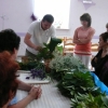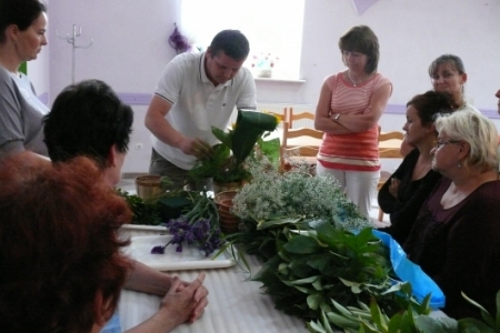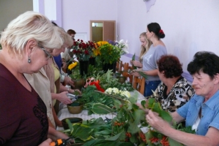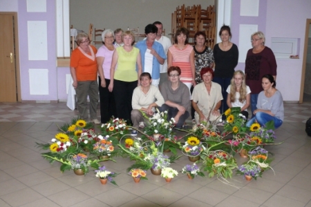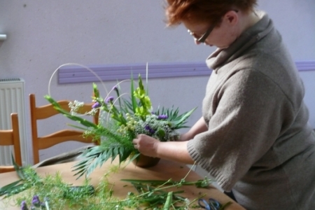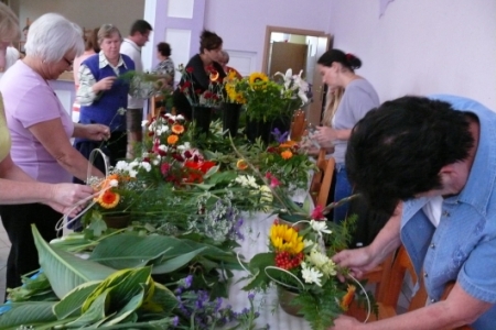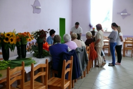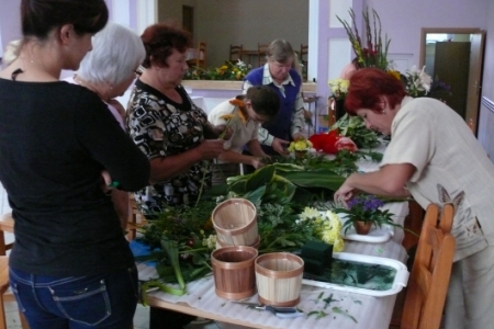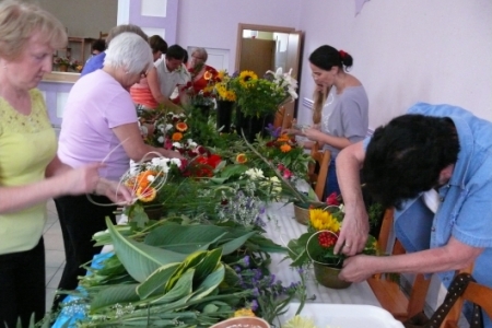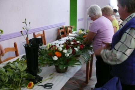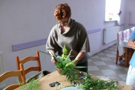 Pierwsze bukiety układał Pan Bartek wyjaśniając przy tym zasady dobrej kompozycji, następnie wszystkie Panie – mając do dyspozycji piękne kwiaty przywiezione przez florystę – przystąpiły do układania swoich bukietów.
