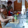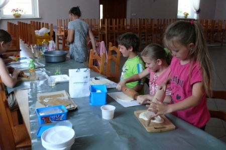 Dzieci uczestniczyły również w warsztatach w ramach projektu „Na polanie”, które obejmowały warsztaty kulinarne (naleśniki, grillowanie, kociołek) oraz kwiaty z bibuły. Było dekorowanie stołów i najbardziej oczekiwana degustacja naleśników.