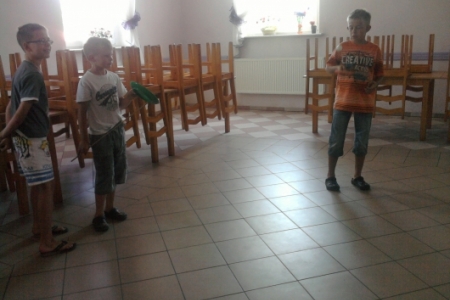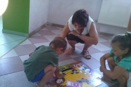 W środy zajęcia prowadzone były przez pracownika CETS – panią Olę. Obejmowały one gry i zabawy – planszowe, ruchowe oraz plastyczne dla dzieci, układano puzzle, malowano kredą na chodniku.