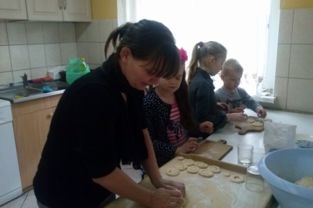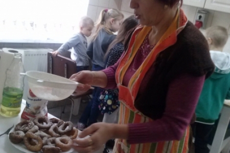 …. I tak minęły prawie dwa tygodnie przy grach i zabawach, bo ostatniego dnia w „Tłusty czwartek” dzieci robiły oponki pod wodzą pani Ewy Kowal i później zajadały się nimi – zakończenie ferii było bardzo smakowite i słodkie!