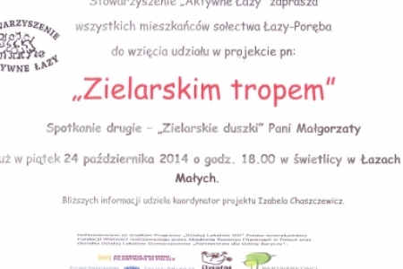Już w najbliższy piątek zapraszamy na drugie spotkanie w ramach projektu "Zielarskim tropem". Tym razem Pani Małgorzata Borkowska nauczy nas wykonywać swoje autorskie "zielarskie duszki". Spotykamy się tradycyjnie w świetlicy wiejskiej w Łazach Małych o godz. 18.00.