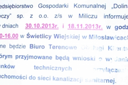 Dnia 30.10.2013 r. w godzinach od 13.00 do 16.00 w świetlicy wiejskiej w Miłosławicach czynne było Biuro Terenowe Obsługi Klienta Przedsiębiorstwa Gospodarki Komunalnej ,,Dolina Baryczy" sp.z o.o z siedzibą w Miliczu .W tym czasie mieszkańcy Miłosławic mogli składać wnioski o wydanie warunków technicznych przyłączenia nieruchomości do sieci kanalizacji sanitarnej.