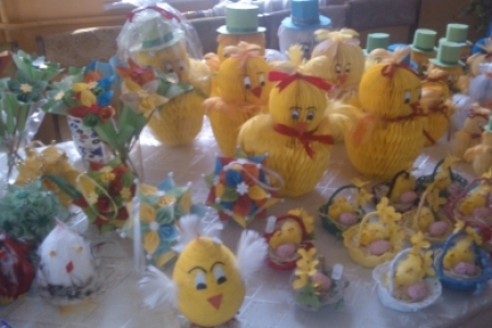 Przygotowane ozdoby wielkanocne zachwycały kupujących. Dużym zainteresowaniem cieszyły się palmy wielkanocne. Każdy mógł znaleść tu coś dla siebie na wielkanocny stół.Na stołach królowały m.in. koszyczki z kordonka, pisanki wykonane rożną metodą, kraszanki, papierowe kurczaki i zające. Nie zabrakło również baranków z ryżu i wełny oraz kwiatów z krepiny.
