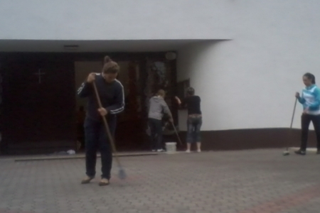Młodzież chętnie pomaga w przygotowaniach do odwiedzin Biskupa.