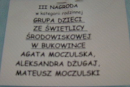 Nagrody w imieniu pana burmistrza Jana Dżugaja wręczała pani inspektor oświaty W. Cijka. Grupa dzieci ze świetlicy środowiskowej w Bukowince zdobyła III miejsce. Z wielką radością odebrały dyplom i nagrodę książkową.