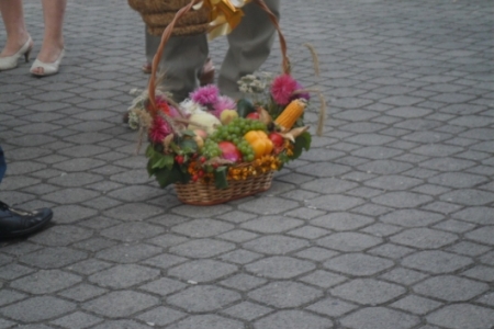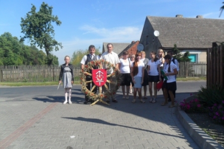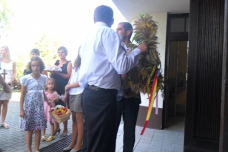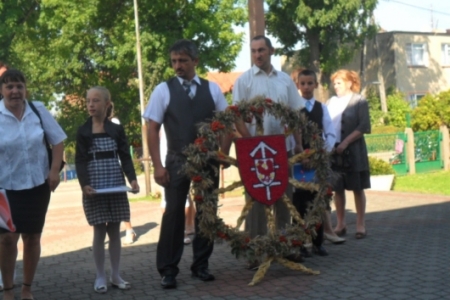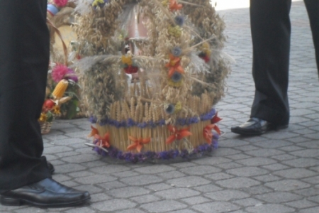 Zebrani przed Kościołem z pięknymi wieńcami dożynkowymi, chlebem z mąki pochodzącej z tegorocznych zbiorów, oraz pieśnią na ustach „Plon, niesiemy plon”.