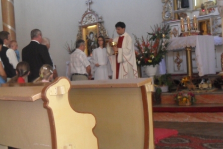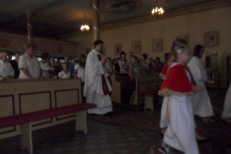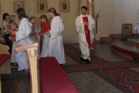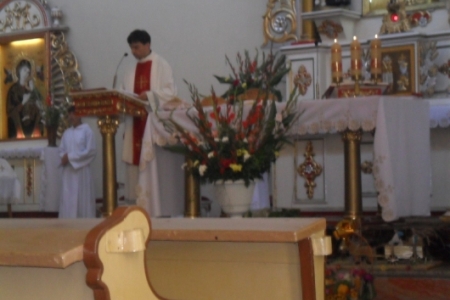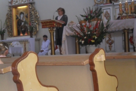 Uroczysta Msza Święta rozpoczęła się przekazaniem wieńców i chleba duszpasterzowi przy ołtarzu, przy akompaniamencie naszego chóru, na czele z panią Wiesią Frajman, oraz Mariuszem Woźniakiem, który grał na organach i gitarze.