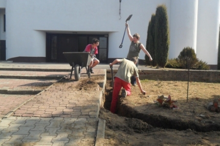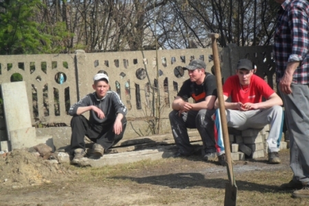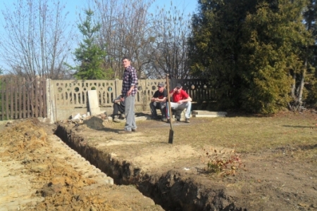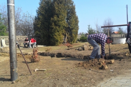 Ciężką pracę usunięcia starego, betonowego ogrodzenia oraz wykopania dołu pod fundamenty wykonała grupa mieszkańców z Brzeziny i Pakosławska pod wodzą sołtysa H. Kuriaty.