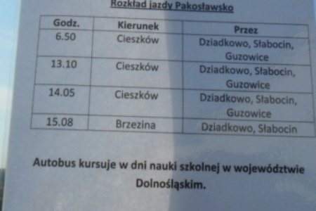 „Informujemy że od dnia 3.09.2012r. dotychczasowe autobusy szkolne kursujące na terenie gminy Cieszków będą kursowały jako regularne linie autobusowe. Osoby które byłyby zainteresowane przejazdem naszymi autobusami mają tę możliwość po wykupieniu biletu jednorazowego u kierowcy. Natomiast bilety miesięczne wykupujemy pod niżej wymienionym adresem.