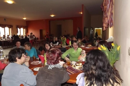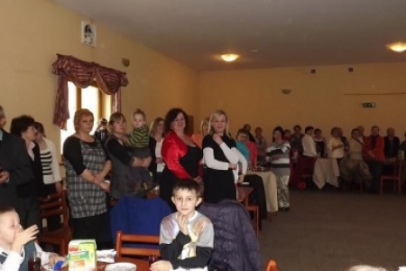 W wypełnionej świetlicy zaśpiewano gromkie „sto lat”, po czym kobiety z lampkami wina zasiadły przy suto zastawionych stołach, na których znalazły się m.in. krokiety z barszczem, kiełbasa na gorąco, bigos, sałatki, jajka w majonezie, wędliny, placki, kawa i herbata.