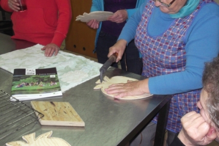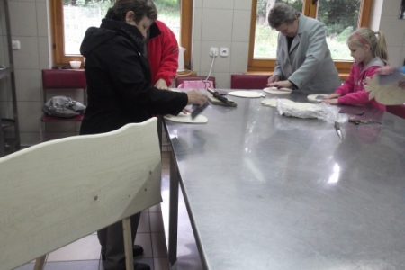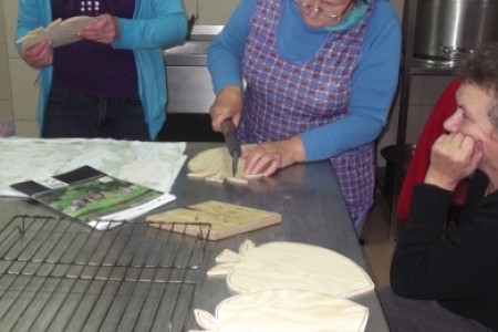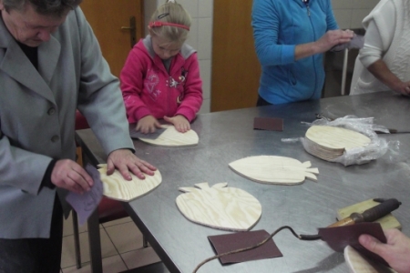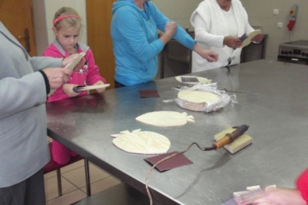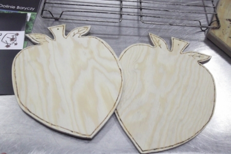 Deseczki zostały wcześniej przygotowane przez jednego z mieszkańców naszej wsi a później podczas warsztatów nadano im pożądany kształt i fakturę. Panie czyściły je papierem ściernym, oraz wypalały kontury za pomocą lutownicy. Każda z mieszkanek mogła spróbować swoich sił w przyozdobieniu deseczek. Nasze deski posłużą zarówno nam jak i dzieciom podczas różnego rodzaju przygotowywania potraw w kuchni a także będą ozdobą stołu jako podkładka pod gorący półmisek. Deseczki są promocją naszej Truskawkowej Wsi.