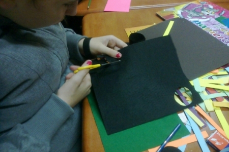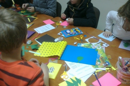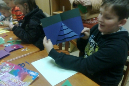 Na zajęciach plastycznych dzieci miały szanse użyć swojej wyobraźni i zdolności artystycznych. Wykonywały kartki świąteczne według własnych pomysłów. W tym celu miały dostęp do różnorodnych ozdobników-brokatu, wstążek, bibuły, kolorowych wycinanek i wielu innych.
