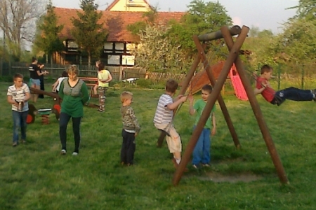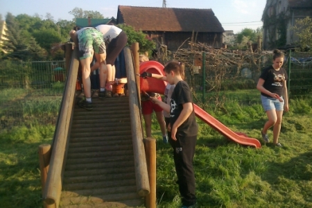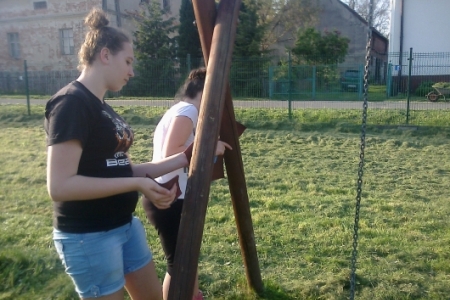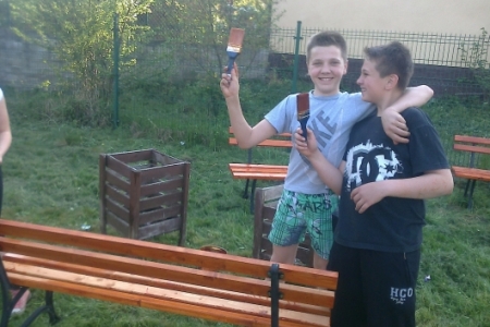 Na umówioną godzinę przybyli nie tylko dorośli ale i również dzieci i młodzież, którzy korzystają z placu zabaw. W ruch poszły farby i pędzle gdyż drewniane i metalowe elementy konstrukcji były już podniszczone. Dzieci chętnie zajęły się malowaniem huśtawek i drewnianego domku ze zjeżdżalnią a dorośli zajęli się wykopywaniem starych i połamanych ławek w miejsce których stanęły zakupione z funduszu sołeckiego nowe i solidne ławki. Praca przy odnowie urządzeń do zabaw sprawiła dzieciom i dorosłym wiele radości. Młodsza część „ekipy remontowej” biegała z pędzlami i postanowiła pomalować nie tylko huśtawki ale i przy okazji siebie nawzajem. Zabawa była przednia a zyskał na tym wygląd naszego placu zabaw.