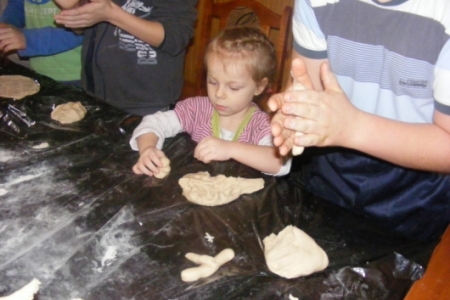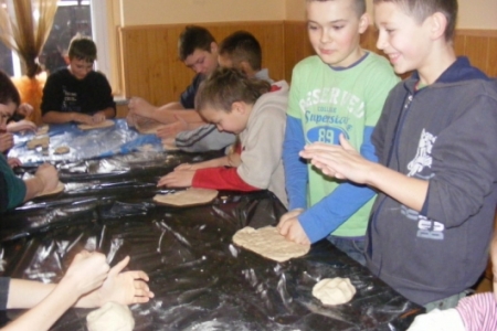 Końcowka I tygodnia ferii była pasjonująca.W czwartek p. Kasia poprowadzila zajęcia plastyczne oparte na masie solnej.Każdy mógł wykonać dowolną liczbę figurek.Było zabawnie.Następnie grupa najstarszych chłopców przygotowała sałatkę owocową.Pycha!!! Zabawy z chustą Klanzy,gry sportowe i stolikowe wypelniły resztę zajęć.
