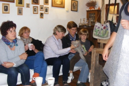 29 października odwiedziliśmy gospodarstwo Beaty Piekalskiej w Lędzinie.Wizyta związana była z kolejną techniką naszej ANU,czyli filcowaniem wełny.W uroczym domku,pełnym zapachu i smaku minionych lat,poznawałyśmy zasady tej techniki.Pani Beata omawiała poszczególne fazy przygotowania wełny do filcowania,pokazała niezbędne do tego przybory i wreszcie wykonane przez siebie wyroby: szaliki, czapki, torby,ozdoby itp.Uczestniczki spotkania były pod wielkim wrażeniem efektów posługiwania się tą technikę.Umówiłyśmy się na praktyczne zajęcia w przyszłym roku.