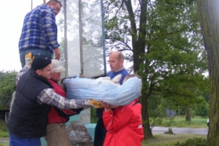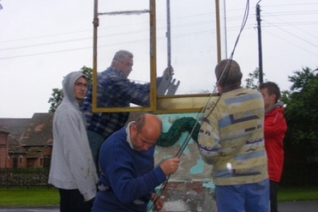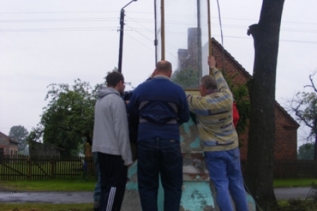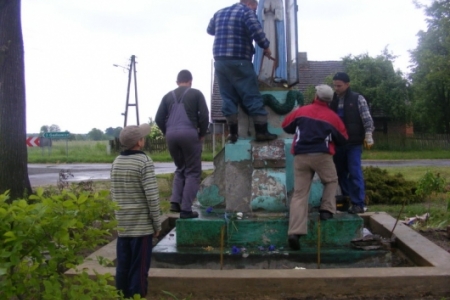 Rozpoczęły się prace związane bezpośrednio z renowacją I kapliczki.W maju ,dzięki pomocy Zakładu Rybackiego w Potaszni,udało nam się zlikwidować "dziki przejazd " przez skwer,na którym znajduje się kapliczka.Nawieziona została ziemia,posiana trawa i przesadzone krzewy.Teraz zdemontowana została figurka i jej osłona.Trwają prace renowacyjne cokołu,które przeprowadzają Zdzisław i Szymon Okrutnikowie- mieszkańcy sołectwa.Kapliczka odzyska dawny blask. Ponadto odnowiona zostanie figurka Maryji i zamontowana zostanie nowa osłona.Prace te są możliwe dzięki pozyskaniu przez stowarzyszenie "Brapoja" środków finansowych z Europejskiego Funduszu Rozwoju Wsi Polskiej.