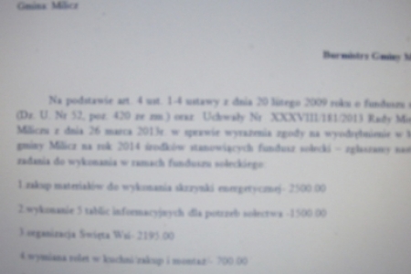 Na podstawie art. 5 ust. 1-4 ustawy z dnia 21 lutego 2014 roku o funduszu sołeckim (Dz. U. z 2014r, poz. 301) oraz Uchwały Nr LVI/263/2014 Rady Miejskiej w Miliczu z dnia 27 marca 2014r. w sprawie wyrażenia zgody na wyodrębnienie w budżecie gminy Milicz na rok 2015 środków stanowiących fundusz sołecki – zgłaszamy następujące zadania do wykonania w ramach funduszu sołeckiego: