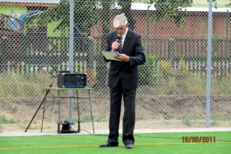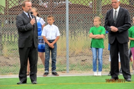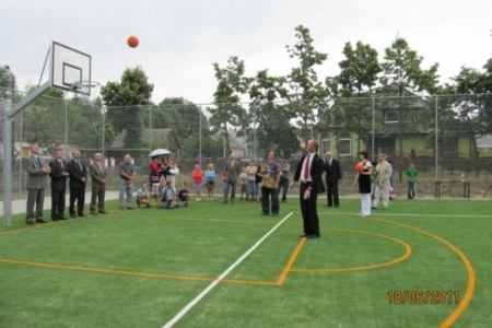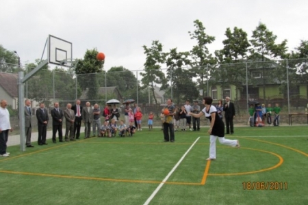 Po uroczystym przecięciu wstęgi, nastąpiło wystąpienie zaproszonych gości, którzy wręczyli uczniom upominki w postaci sprzętu sportowego, niezbędnego do korzystania z nowego boiska. Następnie, każdy z przybyłych gości miał okazję wykonać honorowy rzut piłką do kosza.