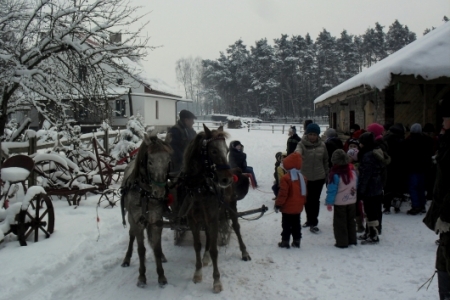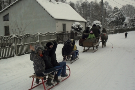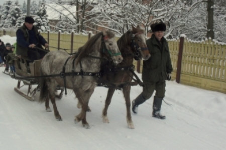 Dnia 22.02.2013r. w godzinach południowych cała społeczność szkolna w pełnej gotowości dotarła do Ośrodka Jeździeckiego ,,Jurand” Pana Jerzego Kątnego. Na miejscu czekały już zaprzęgi konne z saniami oraz miejsca przy ognisku. Wszystko dopięte było na ostatni guzik. Saneczki z młodszymi dziećmi, dla bezpieczeństwa, ciągnęły małe koniki. W przerwach pomiędzy przejażdżkami, w salce Ośrodka Jeździeckiego czekała na uczestników gorąca herbata oraz pyszna grochówka przygotowana przez mamy z Rady Rodziców. To nic, że zdarzyło się komuś zanurkować w puszystym śniegu, z rumianymi policzkami i zdrowymi uśmiechami , wróciliśmy do domów . Będzie co wspominać do następnej zimy…