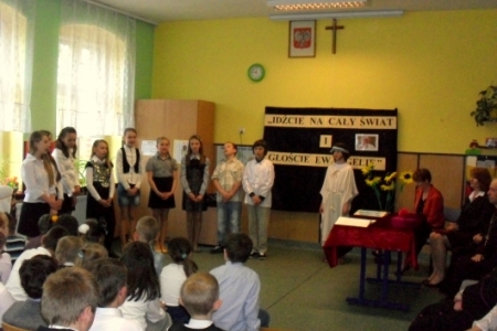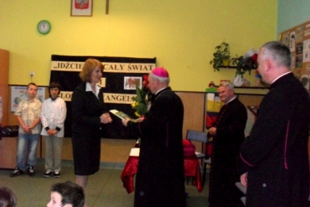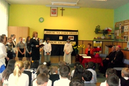 Dostojnego gościa uczniowie powitali radosną pieśnią: ”Oto jest dzień, który dał nam Pan”. Pani Dyrektor Renata Skorupa witając naszych Gości, przypomniała historię szkoły , wspomniała o walorach miejscowości, a także wyraziła wdzięczność za współpracę z Księdzem Proboszczem. Następnie uczniowie przedstawili scenę z życia Pana Jezusa. Uwieńczeniem były życzenia , kwiaty i upominki złożone na ręce ks. Biskupa.