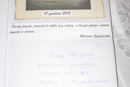 Inwestycja została sfinansowana ze środków Gminy Przygodzice oraz ze środków unijnych z Programu Rozwoju Obszarów Wiejskich. Na uroczystości otwarcia sali wiejskiej oraz nieco wcześniej wybudowanej wiaty przy tejże sali obecni byli Wójt Gminy Przygodzice Pan Krzysztof Rasiak wraz z przedstawicielami komórek organizacyjnych gminy, władze powiatu ostrowskiego na czele ze starostą Panem Pawłem Rajskim, ks. Kan. Edmund Sieczka proboszcz parafii Św. Wawrzyńca w Chynowej, poseł Piotr Walkowski, przedstawiciele Stowarzyszenia Partnerstwo dla Doliny Baryczy, radni powiatowi i gminni oraz sołtysi i przedstawiciele organizacji działających na terenie sąsiadujących wsi, osoby bezpośrednio zaangażowane w budowę oraz mieszkańcy Przygodziczek. Po wystąpieniach oficjalnych i poświęceniu świetlicy przez księdza proboszcza, nastąpiło przecięcie wstęgi i wszyscy mogli zobaczyć pomieszczenia wewnątrz. Uroczystość uświetnił występ dzieci ze Szkoły Podstawowej pod kierunkiem swoich nauczycieli. Świetlica usytuowana została w miejscu starej i wygląda wspaniale! Posiada wewnątrz dużą salę ogólną, pomieszczenia magazynowe oraz w pełni wyposażoną kuchnię. Na potrzeby miejscowości jest zupełnie wystarczająca.Koło Gospodyń Wiejskich przygotowało poczęstunek dla wszystkich uczestników imprezy, a przez cały czas można było posłuchać wspaniale wykonywanych piosenek przez zespół Boćki z Przygodzic. Mieszkańcy miejscowości podkreślali ogromne zadowolenie, że to u nich powstał taki obiekt, a sołtys Przygodziczek Pan Paweł Chudy już przygotowuje plany dotyczące wybudowania nowej remizy strażackiej.