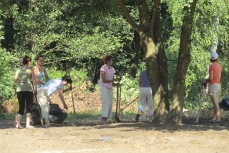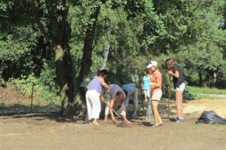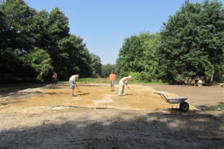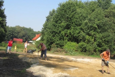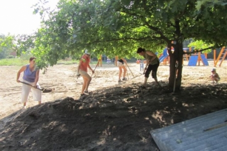 Zaczęliśmy prace od 16 i 18 lipca - przy terenie rekreacyjnym i placu zabaw, 19 lipca rozpoczęto prace przy boisku do piłki nożnej, a międzyczasie dojrzeliśmy do boiska do piłki plażowej. Już 4 sierpnia montowano nam urządzenia na placu zabaw. Rosły kolorowe, przyciągające dzieci zabawki – ale jeszcze nie można było się pohuśtać i zobaczyć do czego jest taka ścianka z „dużymi guzikami” – no i to marzenie żeby dorośli zdążyli przed jesienią. Dopiero 27 sierpnia mogliśmy wejść na plac „budowy” – to było prawdziwe „pospolite ruszenie”. Od rana huczały piły i kosiarki, grabie, łopaty i taczki cały czas w użyciu. Rodzice pracowali a dzieci już szalały na urządzeniach. Kilka godzin tego dnia trwały prace a na koniec trzeba było wyraźnie sobie powiedzieć, że czas już do domu bo chyba noc by nas zastała.