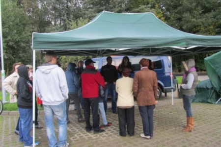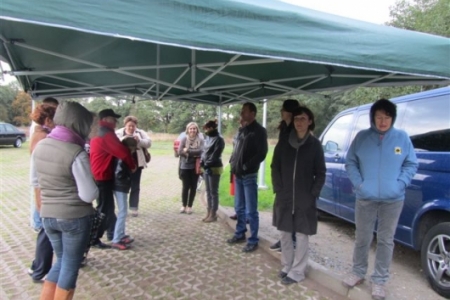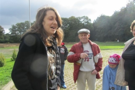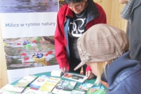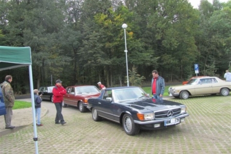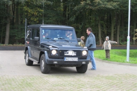 O 11 godzinie niebo się zachmurzyło i zaczął padać deszcz, dodatkowo przenikające zimno „wgoniło” oczekujących mieszkańców pod rozpięty przez przewidujących organizatorów dach namiotu. Przez blisko godzinę, dzielnie przytupując z zimna, oczekiwaliśmy na dwuślady, a jedynymi pojazdami były nasze jednoślady ustawione na parkingu. No i w końcu zajechał o 12.03 pierwszy mercedes a później co kilka minut następne stare mercedesy. Oczekując na samochody zajęliśmy się materiałami o Dolinie Baryczy przyniesionymi przez niezawodną p. Zosię Pietrykę – dzięki temu i realizowanemu przez nas programowi „Ruda Milicka - ptasi raj” mogliśmy bezbłędnie odpowiedzieć na pytanie 8 (i nie tylko) testu z wiedzy o Dolinie Baryczy, przygotowanego dla kierowców: „Z wymienionych gatunków ptaków, podkreśl 5 występujących na stawach milickich: wodniczka, błotniak stawowy, orzeł przedni, flaming, bąk, czapla siwa, kakadu, kormoran, żuraw” – choć kto wie może w wyniku ocieplenia klimatu doczekamy się na kakadu i flaminga – też pięknie prezentowałyby się w naszym „ptasim raju”. Nie wiemy czy któryś z kierowców postawił jednak na kakadu.