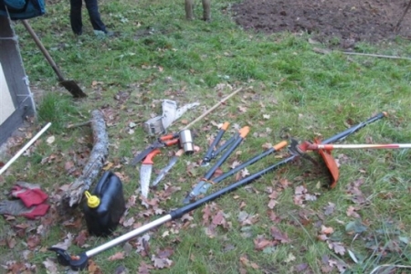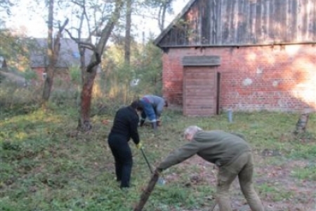 Wydawało się nam, że szybko wykosi się trawę, przekopie kawałek gruntu pod rośliny i jeszcze na popołudniowe porządki domowe zostanie trochę czasu – a tu - okazało się, że mamy do czynienia niemal ze stanowiskiem archeologicznym. Trawa i chwasty porosły i przykryły pozostawione po remoncie druty, deski, gałęzie, kamienie, butelki i wiele innych niespodzianek. Naskładało się tego na ogromny wór, każda przekopana skiba też ujawniała nowe „skarby” Pan Romek przebijał się kosiarką spalinową przez chaszcze a jako jedyny mężczyzna jeszcze podcinał suche gałęzie drzew. W ruch poszły łopaty, grabie, podcinarka akumulatorowa, sekatory. Porządkowanie trwało do zachodu słońca. Pracom przyglądały się dwa psy, którym się wydawało, że poszły na spacer. Przed Chatą posadzone zostaną irgi, berberysy, derenie jadalne, jarzębina i głogi. Wstępny termin nasadzenia 14 -15 listopada.