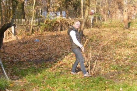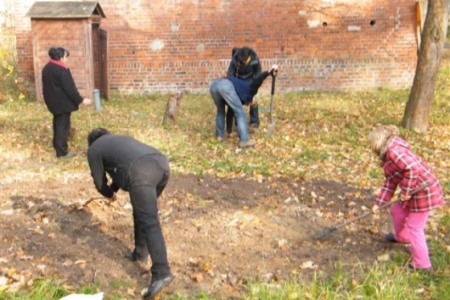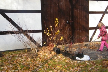 Przy wiacie posadzono jarzębiny, berberysy czerwone, pęcherznice kalino listne, leszczyny, trzmieliny uskrzydlone. Na wiosnę będzie miało co kwitnąć a jesienią będą owoce dla ptaków, a dla wiewiórek orzechy. Na przekopanej grządce, ponieważ zmieniła się koncepcja sadzenia wysiano trawę.
