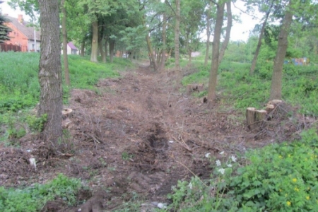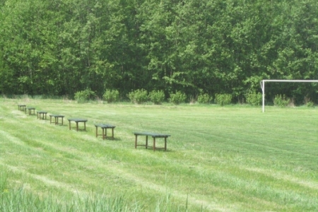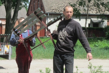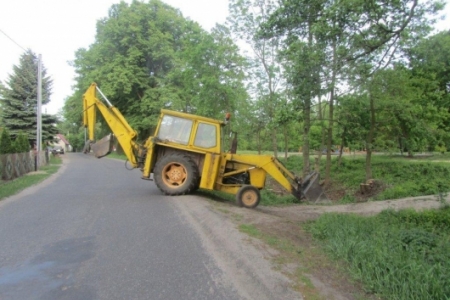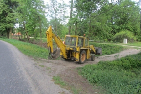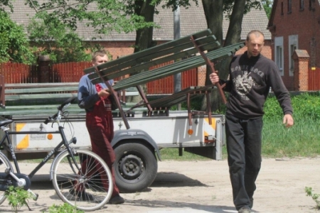 Pod drzewami na skwerku przy placu zabaw dla dzieci, bo tam na utwardzonym placyku w czwartek postawione zostały ławki. Zarówno rodzice pilnujący dzieci, jak i ci, którzy chcą po prostu posiedzieć, pogawędzić z kimś i odpocząć już mogą to zrobić w ładnym otoczeniu. Również wzdłuż ścieżki rowerowej przy boisku stoi siedem ławek, kibicując na meczu można posiedzieć wygodnie a nie na trawie. Oczywiście turyści jadący rowerami też mogą odpocząć pod warunkiem, że będą przestrzegać pewnych reguł: zabierać ze sobą swoje śmieci i szanować naszą pracę – bo przecież sami wszystko robimy a mieszkańcy bardzo dbają o swój teren rekreacyjny. Pan Stanisławski przygotował ławki do ustawienia a pani Regina jak zwykle przyszła natychmiast jak przywieźli ławki, żeby pomóc jeśli będzie taka potrzeba. Pani sołtys też ustawiała a ja mogę zaświadczyć, że siedzi się wygodnie. Po południu w piątek przy naszym rowie pracował już spychacz, przygotowując rów do zasypania.