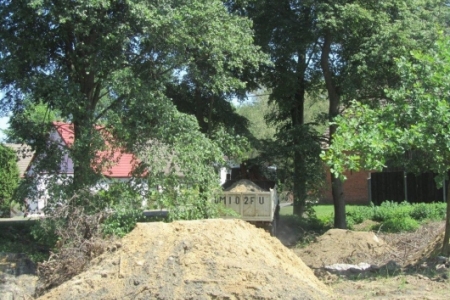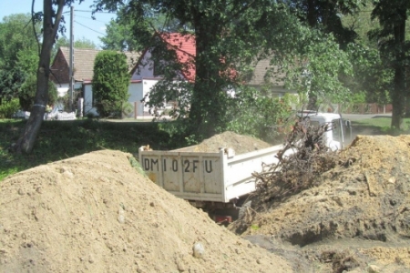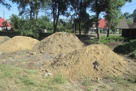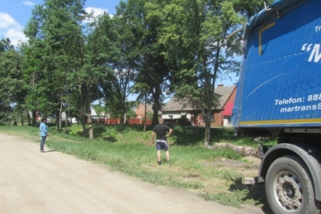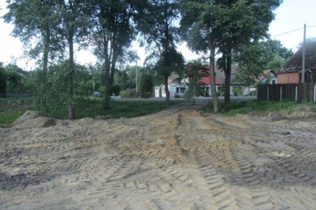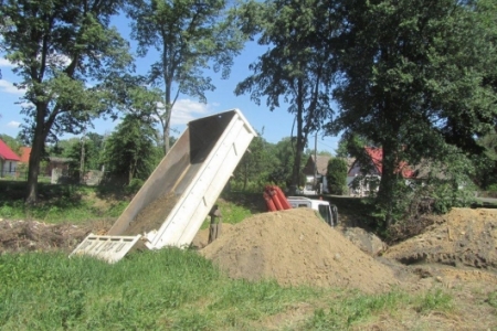 Od rana wielkie wywrotki przywoziły ziemię, którą dostaliśmy od Gminy w prezencie. Na miejscu pracował spychacz a w punkcie pobierania ziemi ładowarka. Wszystko razem trwało 10 godzin. O 16 godzinie mieszkańcy byli proszeni do prac wspólnych przy oczyszczaniu rowu ze śmieci. Tym razem do pracy stawiły się jak zwykle te same panie, które przychodzą niezawodnie za każdym razem i tylko jeden mężczyzna: pan Jarosz, o przepraszam – był jeszcze jeden pan - 4 letni Emilek, który bardzo aktywnie uczestniczył w pracach a przy okazji rozdawał jeszcze kwiaty paniom. Zadziwiające, że tak skromny był zespół panów, ponieważ śmieci to przede wszystkim męska rzecz: butelki po wódce, winie, puszki po piwie a nawet trafił się sweterek męski. Do rowu te przedmioty trafiały prawdopodobnie w wyniku celnych rzutów butelką. Byłabym zapomniała – pojawił się również z gospodarską wizytą członek Rady Sołeckiej – Pan Krzysztof. Prace trwały do godziny 19.30 ale efekt już widać.