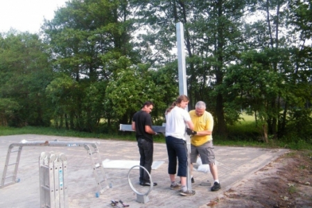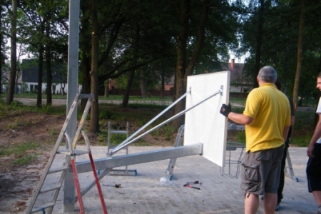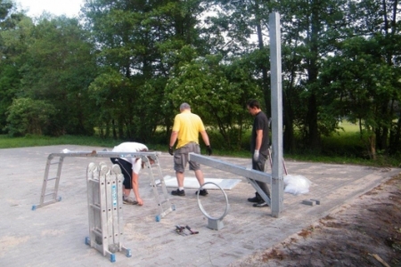 Wydawało nam się, że zamontowanie takich koszy to chwilka – bo przecież otwory były zostawione, a więc tylko osadzić słupy. Jednak biorąc pod uwagę to, że częścią piłki do kosza jest koszykarz – bo dla fasonu musi na koszu po wrzuceniu zawisnąć – to cała konstrukcja musi być na te obciążenia odporna. Na zdjęciach widać jakie to trudne i wymagające odpowiedniego sprzętu zajęcie.
