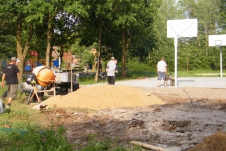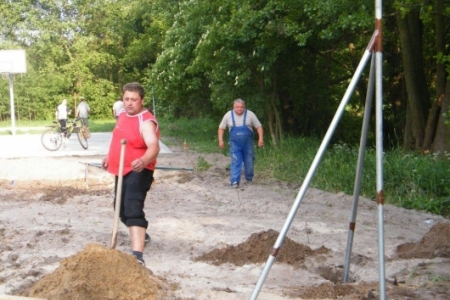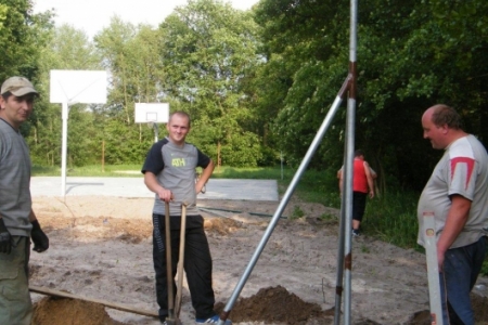 Mieszkańcy Rudy Milickiej z pomocą sąsiadów szlifują boisko wielofunkcyjne i jego otoczenie.