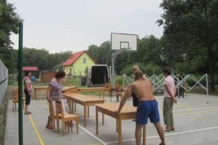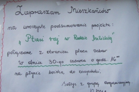 Jeszcze nie podsumowujemy swojej działalności pomimo, że kończymy program Ruda Milicka – Ptasi Raj, zakończyliśmy prace przy boisku wielofunkcyjnym a na placu zabaw dla dzieci ciągły ruch. Wszystkie nasze przedsięwzięcia z okresu 2011 – 2012 podsumujemy jesienią na dużym pikniku. Teraz zamykamy zgodnie z harmonogramem trzy zadania: program Ptasi Raj, Boisko wielofunkcyjne i Plac zabaw dla dzieci. Umówiliśmy się na 30 czerwca – będzie to pierwsza nasza wspólna zabawa, zaprosiliśmy gości, przygotowywaliśmy się robiąc plany i dzieląc zadania, dzieci ćwiczą piosenkę, kompleks sportowo – wypoczynkowy jest pucowany, czyszczony, koszony a ostatnie rośliny (zioła) sadzone są przy placyku dla rodziców. Panie kończą pyszne wypieki. Od południa przygotowywane są stoły i dwa namioty choć mamy nadzieję, że mimo chmur i duchoty, nie będzie padać. Większość mieszkańców bardzo się zaangażowała i każdy wie co ma robić a co najważniejsze robi to z przyjemnością.