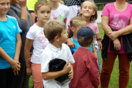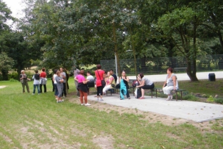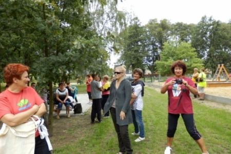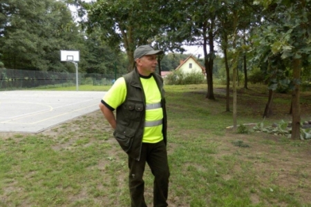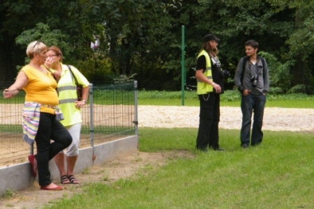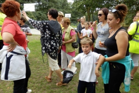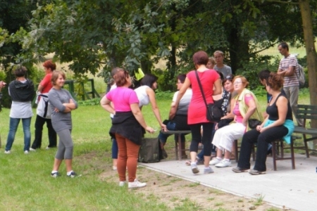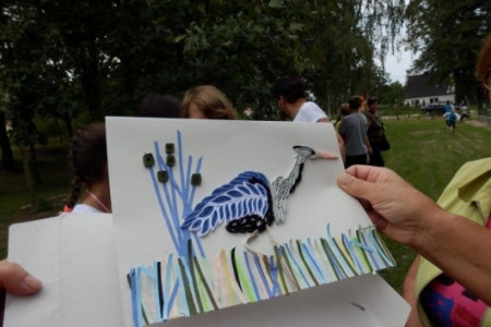 Był to rajd rowerowy między innymi z trasą przez kompleks Stawno, a u nas uczestnicy wycieczki chcieli zobaczyć co udało nam się zrobić w naszej wsi w ostatnim roku. Można powiedzieć, że to nieskromnie, ale my uwielbiamy chwalić się tym, że wszystko co się we wsi dzieje, udało się nam zrobić dzięki aktywności mieszkańców. No i pochwaliliśmy się naszym placem rekreacyjnym i tym, że mamy trzy boiska i tym, że na domach pojawiły się tabliczki z ptakami i naszymi krzewami róż i naszymi projektami. Dostaliśmy piękny upominek – czaplę zrobioną niespotykaną techniką – mamy nadzieję, że to jest piękny początek do naszej wymarzonej galerii. Dziękujemy wszystkim uczestnikom za zainteresowanie i za wnikliwe pytania.