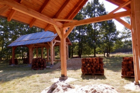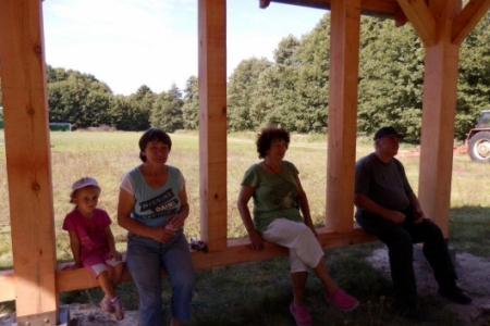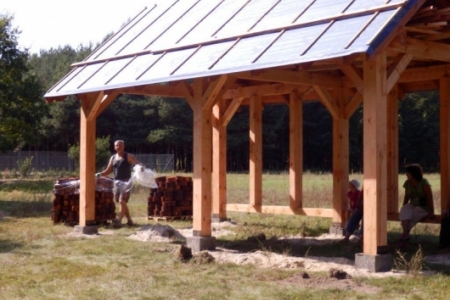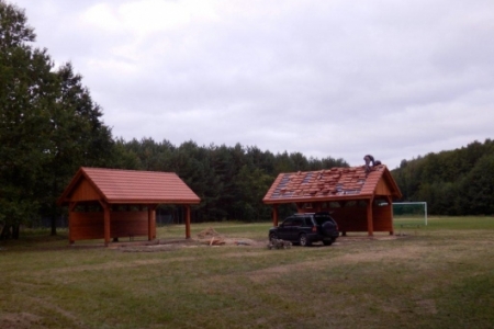 Kolejny tydzień trwają prace przy dwóch wiatach – główne czynności wykonuje przedsiębiorstwo specjalistyczne, ale bez codziennej obecności Pani Sołtys i pomocy mieszkańców w przygotowywaniu miejsca wokół wiat nie dałoby się tak sprawnie wszystkiego zorganizować.
