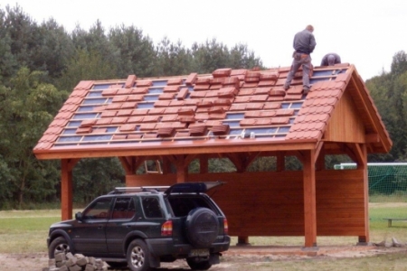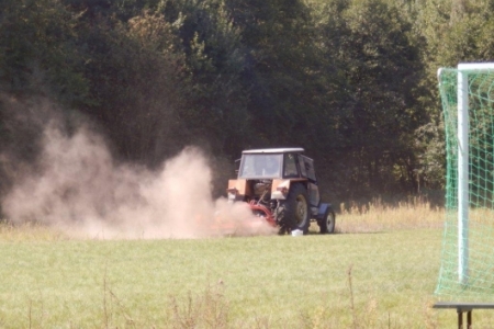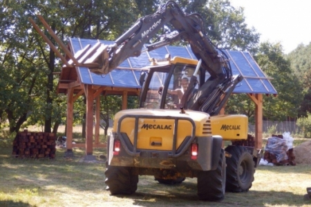 Na plac zjechały maszyny z drewnianą kostką brukową i dachówkami. Bruki już są kładzione a wiaty przed deszczem zostały przykryte płachtami, a w piątek już kładziono dachówki. Skoro i tak miejsce wymagało codziennej obecności Pani Sołtys zamówiła traktor z kosiarką, który obkosił boisko, łąkę oraz wszystkie drogi i dróżki w Dębowie.