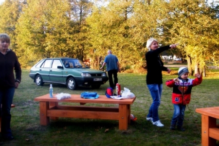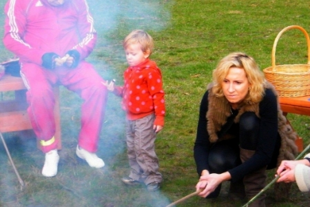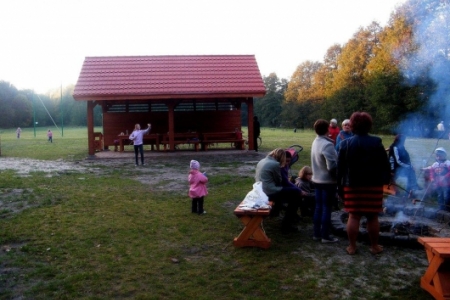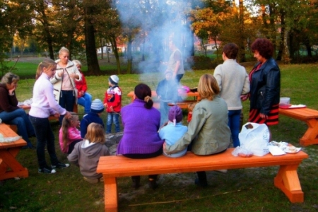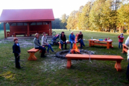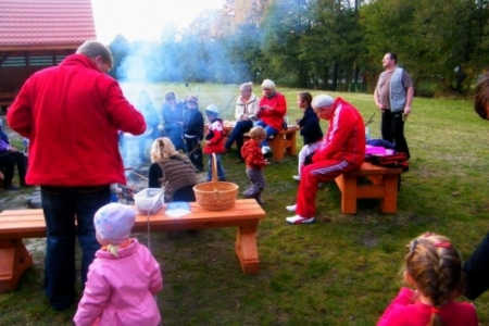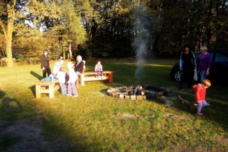 20 października po sadzeniu krzewów, korzystając z ładnej jesiennej pogody, przyszedł czas na pierwsze rozpalenie ogniska. Wszyscy z ochotą zabrali się do wyszukiwania patyków żeby nadziać kiełbaski, dzieci pomagały przynieść drzewo na ognisko i przed 17 godziną zapłonęło w nowo przygotowanym kręgu.