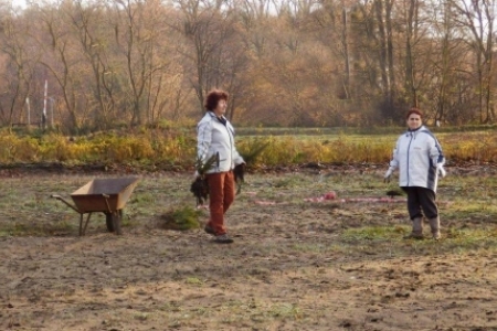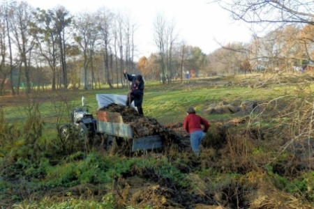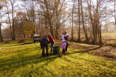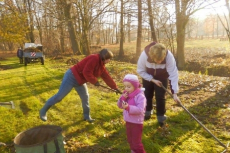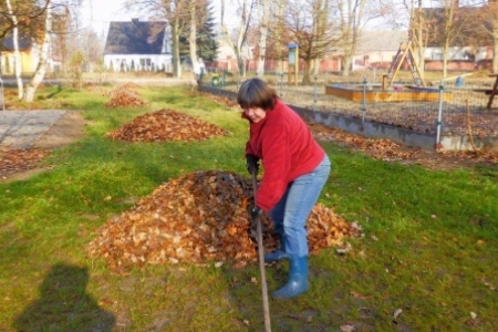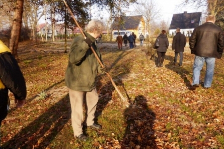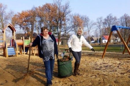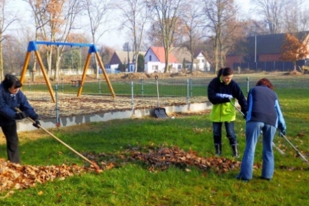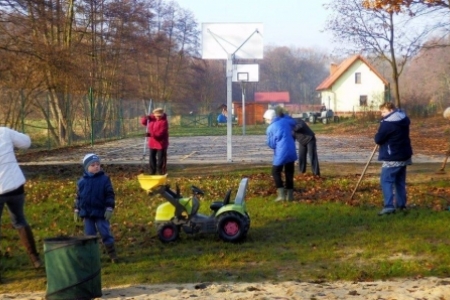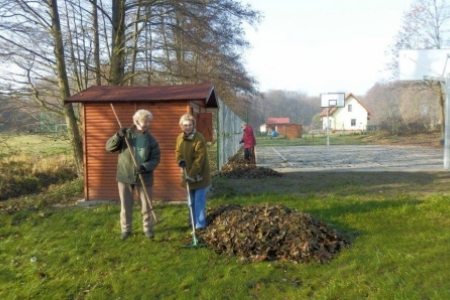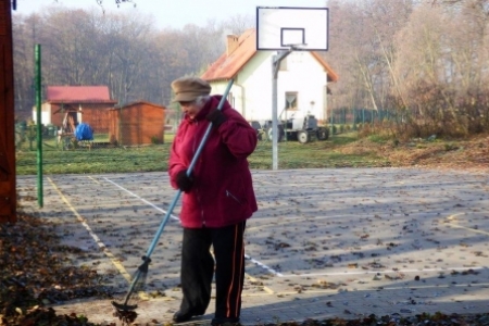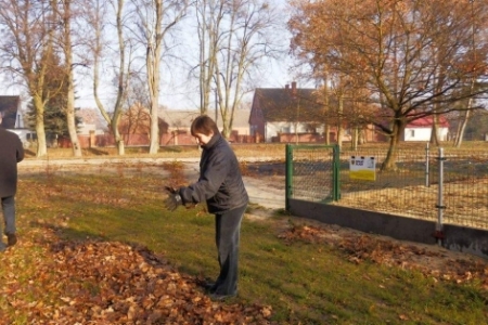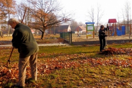 Było to zaproszenie do wspólnej ostatniej pracy w tym roku – nocne przymrozki strąciły ostatnie liście z drzew wokół placu rekreacyjnego w Rudzie Milickiej a ponadto przybyło kilkadziesiąt iglaków do posadzenia zarówno przy placu zabaw jak i wiatach. W sobotę jak na zamówienie była piękna pogoda, przy której praca miała charakter rekreacyjny. Jak zwykle z grabiami, taczkami, łopatami zjawiło się sporo osób – stawiły się głównie panie ponieważ praca była zapowiadana jako lekka, ale z górami liści bez traktorka pana Zygmunta Cieszkowskiego i pracy właściciela nie dalibyśmy sobie rady – metodą do tej pory stosowaną „na płachtę” sprzątalibyśmy kilka dni. A na początku wsi, pod witaczem, samotnie sprzątał liście pan Edward Brzóska. Natura w tym roku była nadzwyczaj hojna i sypnęła na trawnik dywanem jesiennych liści. Po akcji „jesienne sprzątanie” widać już zieleń trawnika, a jeże mają odłożone pod krzakami liście.