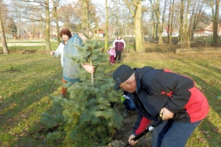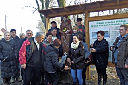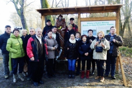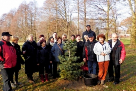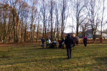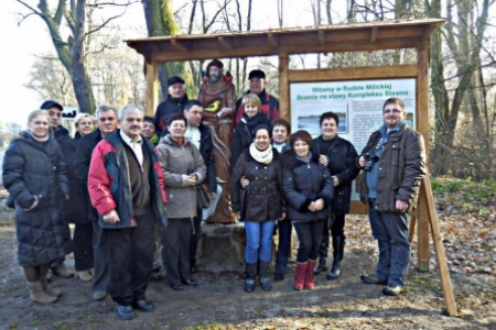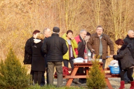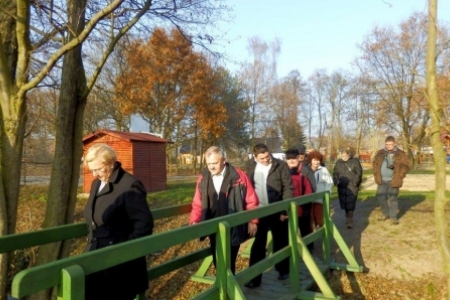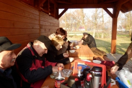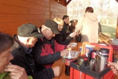 Najczęściej tak mówią o miastach, ale nasi goście byli nadzwyczaj sympatyczni i nie mielibyśmy nic przeciwko temu, by takie spotkania były częstsze. Interesowało ich co trzeba robić, by zachęcić mieszkańców do wspólnej pracy, ale też co udało nam się już zrobić. Rzeszówek też jest wsią, która rozpoczyna drogę do tworzenia charakteru wsi tematycznej: „Wieś pod lasem” jak mówią – swoje domy będą oznaczać różnymi grzybkami. Nasze ptaki na domach też znalazły uznanie. Zaczęliśmy oczywiście od zdjęcia pod witaczem. Na placu rekreacyjnym właśnie trwały prace porządkowe „do ostatniego liścia” i można było sprawdzić w praktyce jak mieszkańcy wspólnie pracują. Ponieważ właśnie kończono sadzenie drzewek to Pan Sołtys z Rzeszówka zasadził u nas przed wiatami sosnę kanadyjską. Zostałyśmy zaproszone na biesiadę pod wiatami ponieważ goście przyjechali z własnej roboty smakołykami. Często oprowadzamy grupy, ale tak zorganizowanej nigdy nie widzieliśmy. W termosach były napoje ale też zupa „z wkładką”, różne mięsa, kiełbasy z dzika, pyszny chleb pieczony we własnym zakresie, no i „środki” pomagające strawić te wiktuały – aż żal, że musieli jechać dalej. Zostało po nich posadzone drzewko, które będziemy pielęgnować tak jak pamięć.