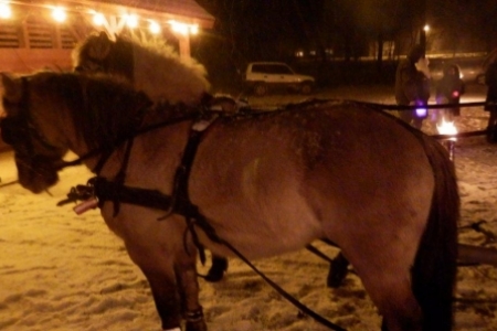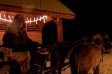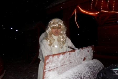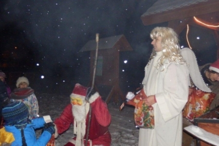 Dzwonki zadzwoniły i pojawił się wóz zaprzężony w dwa koniki – powoził woźnica w futrzanej czapie a za nim siedział Mikołaj z Aniołem i wieźli paczki dla dzieci. Dzieci podchodziły wywoływane przez Mikołaja, który był bardzo dociekliwy i pytał ile dziecko ma lat i czy było grzeczne. Tylko jedna dziewczynka szczerze powiedziała, że nie była grzeczna ale dobry Mikołaj paczkę też dał.