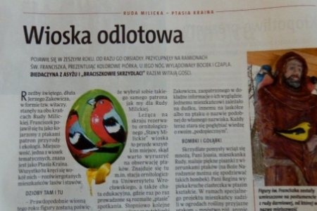 To co szczególnie przyciągnęło uwagę pani Agaty Combik do naszej wsi to figury św. Franciszka wkomponowane w dwa witacze. Figury przedstawiające św. Franciszka wybraliśmy ze względy na charakter naszej wsi jako wioski ptasiej. Witacza stanęły w 2012 r. jako realizacja zadania publicznego w ramach inicjatyw lokalnych. Teraz wizerunki św. Franciszka stały się bardzo popularne odkąd imię to przyjął papież. Na większości obrazów świętego otaczają ptaki i to było inspiracją dla naszego wyboru, bo przecież Ruda Milicka to Ptasia Kraina a przy tym św. Franciszek jest patronem ekologów. Piękne rzeźby do witaczy wykonał pan Jerzy Zakowicz. No i przez te witacze budzimy coraz większe zainteresowanie. Bardzo nam się podobał tytuł artykułu w Gościu Niedzielnym: „Wioska odlotowa”. W artykule tym również zaprezentowano pisanki pani Joanny.