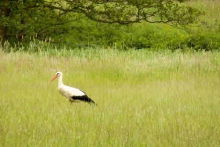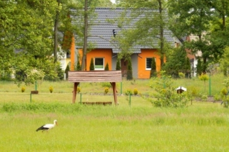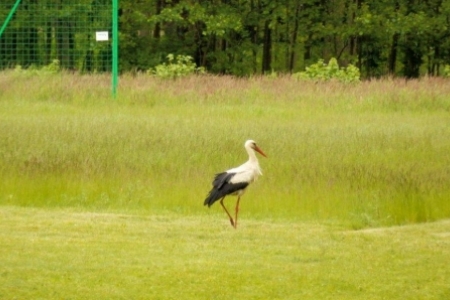 Poszperał, poczytał … i jest. Do Rudy Milickiej na plac rekreacyjny, o którym wiedzą już w Dolinie Baryczy przybył BOCIAN BIAŁY. Wylądował na naszym boisku i kroczył dumnie nie przejmując się wycieczką rowerową na ścieżce, wjeżdżającym na plac pod wiatami samochodem i spacerującymi mieszkańcami.