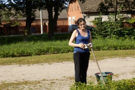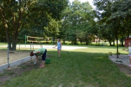 17 lipca znowu plakatem zaprosiła wszystkich pani Sołtys by ujarzmić trawę i chwasty, które są szybsze od nas. Panowie traktorkami skosili boisko i plac pod wiatami, pani Regina z domu „Pod modrą sikorka”, spalinową kosiarką dzielnie kosiła trawę przy placu zabaw. Frekwencja tym razem była większa niż zwykle, bo to sezon urlopowy i pewnie więcej czasu na dodatkowe zajęcia. Dziewczynki ze Stawna i Emilek z domu „Pod Bączkiem” jak zwykle pełni zapału do pracy. Jeden pan – nasz lider przy kopaniu rowów, przygotowywał następny otwór pod siłownię. Prace trwały trzy godziny ale za to jak pięknie wyglądało później nasze Centrum rekreacyjno – sportowe!
