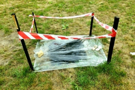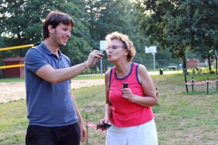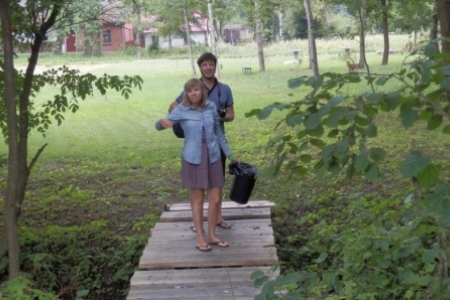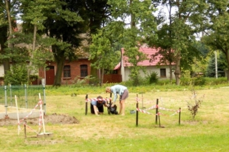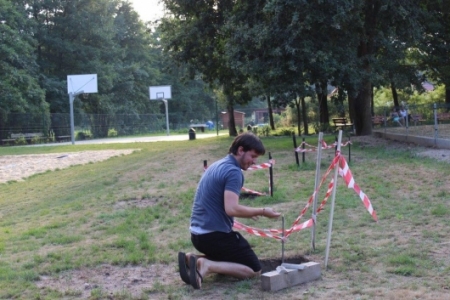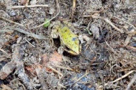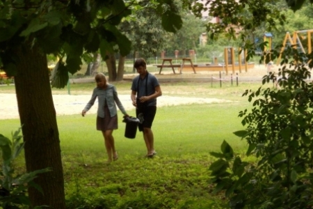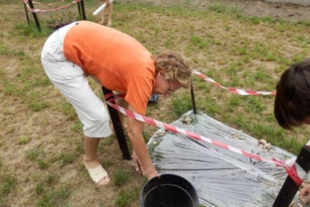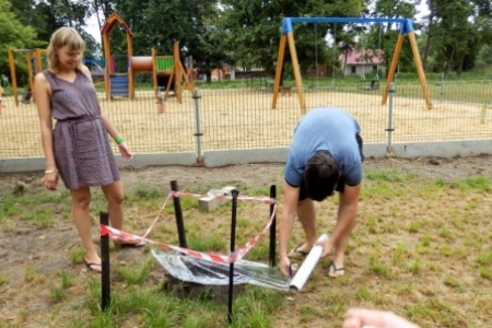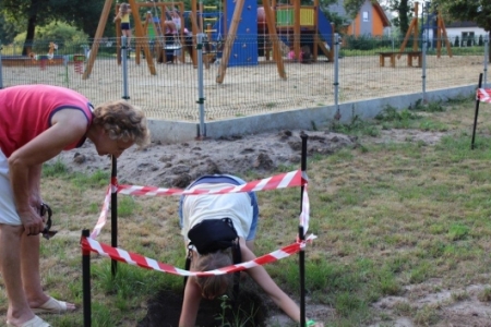 Na naszym placu zostało wykopanych sześć dołów pod osadzenie siłowni zewnętrznych. Ponieważ zamontowanie siłowni trochę się opóźniło, to otwory zostały zabezpieczone taśmami przed przypadkowym wpadnięciem, ale zabezpieczenie to niestety nie uchroniło żab przed wpadaniem w wykopy. Wskakiwały zresztą świadomie, ponieważ przy wyjątkowych upałach tylko w tych dołach było trochę wilgoci, ale też była to dla nich niespodziewana pułapka. Dno pokryło się małymi uwięzionymi żabkami. Z pomocą przyszli im hiszpańscy ekolodzy, którzy zwiedzając nasz plac ulitowali się nad żabami. Żabki zostały wyłapane do wiaderka i wypuszczone do rowu z wodą a otwory zabezpieczone folią. Ten gatunek żab podlega w Polsce ścisłej ochronie a więc powodów do uśmiechów było więcej. Ani i Raulowi dziękujemy.
