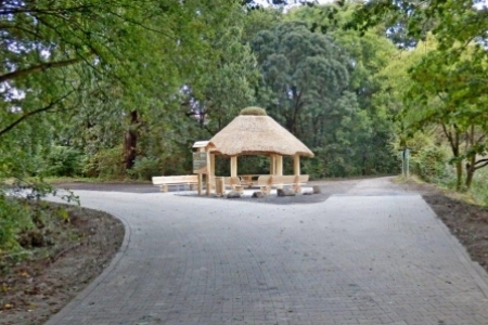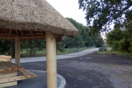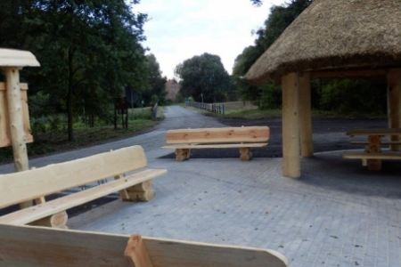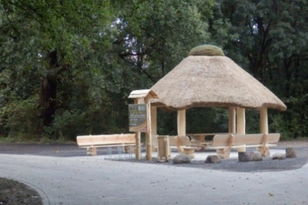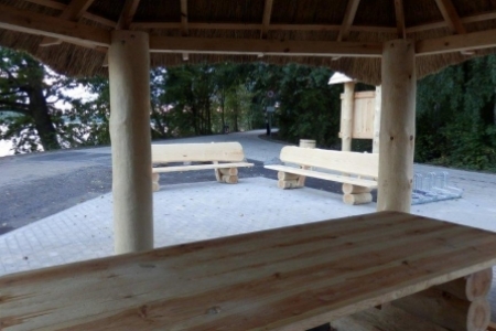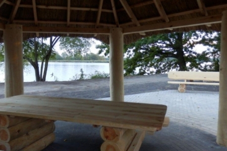 A wracając do grobli to warto (mimo wszystko) dojść do pięknej wiaty i chwilę posiedzieć wszak nad głową solidny dach kryty strzechą.