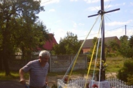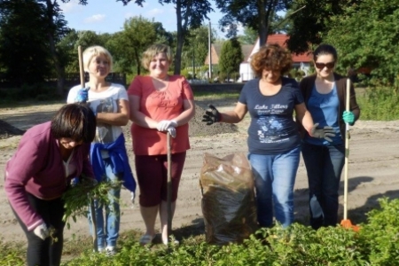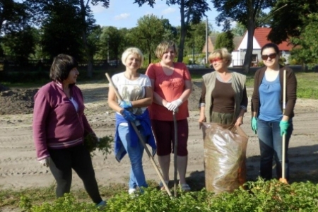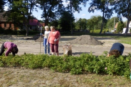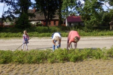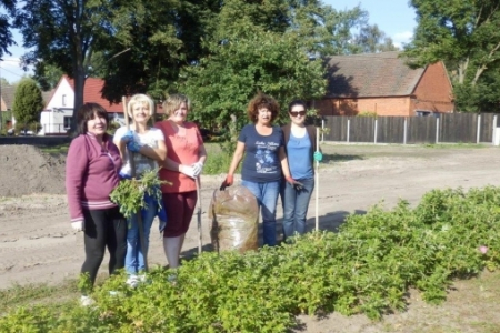 Spotkaliśmy się, zgodnie z zaproszeniem na tablicy, w poniedziałek 23 czerwca na odchwaszczanie naszych róż. Rosną już trzeci rok i w tym roku spodziewaliśmy się, że będą obsypane kwiatami bo pączki zapowiadały urodzaj. Zastaliśmy róże „ogolone” ze wszystkich młodych pędów no i oczywiście kwiatów. Pani Dorota mówi, że jak rano jedzie do pracy to z naszego placu rekreacyjnego wracają sarny ze śniadania. Wydawałoby się, że jest dużo świeżej trawy to róża nie będzie atrakcyjna dla sarny, jednak one chyba też czują „to coś” i wolą śniadanie różane niż z trawy. Różom też się coś należy – odchwaściłyśmy „przystrzyżone” róże a jedyny mężczyzna w tym czasie robił porządki przy krzyżu.